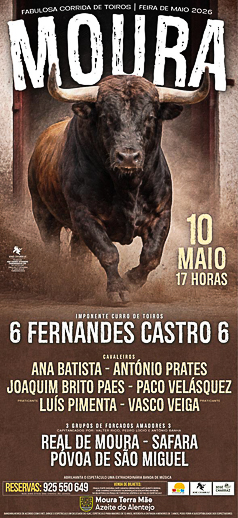 Em praça estarão 6 cavaleiros, serão eles Ana Batista, António Prates, Joaquim Brito Paes, Paco Velasquez, Luis Pimenta e Vasco Veiga para lidarem toiros da ganadaria Fernandes Castro.
