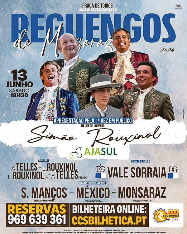 Em praça estarão os cavaleiros A. Telles, A. Telles Filho, L. Rouxinol e L. Rouxinol Jr., com a atuação dos Forcados Amadores de S. Manços, México e Monsaraz.